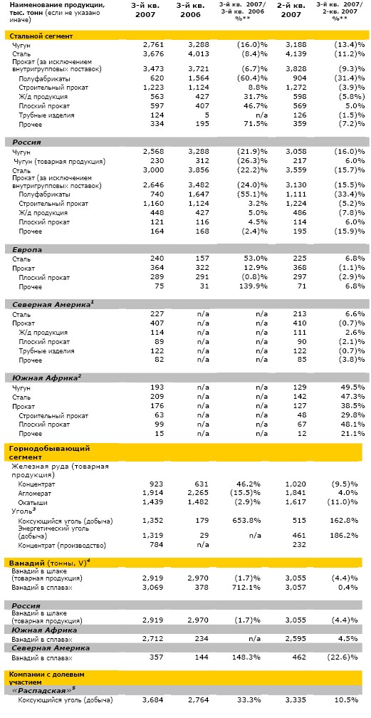 4 В пересчете на чистый ванадий. Данные включают производственные результаты "Стратиджик Минералз Корпорейшн", которые консолидируются с сентября 2006 г., и "Хайвелд Стил энд Ванадиум Корпорейшн", консолидируемые с мая 2007 г.