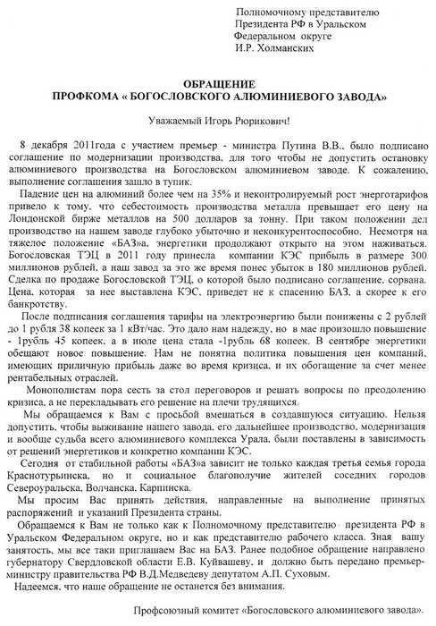 Чтобы этого избежать, профсоюзные лидеры БАЗа переходят к открытым массовым действиям. Профсоюзный комитет ГМПР Богословского алюминиевого завода при поддержке Свердловского областного комитета профсоюза принял решение 2 сентября с 10-30 до 12-00 провести на центральной площади Краснотурьинска митинг рабочих, без флагов и лозунгов каких либо партий и движений, где будет озвучено видение профсоюза по решению проблемы закрытия электролизного производства. А позиция профсоюза проста, она заключается в необходимости модернизировать производство, а не закрывать его. И в этом должны быть заинтересованы не только администрация предприятия и его профсоюзный комитет, но и государство, которое в состоянии решить проблему сверхвысоких тарифов на электроэнергию. Митинг под лозунгом "За достойное будущее завода и города" будет проведен в соответствии со всеми законами и нормами РФ, регулирующими подобные вопросы, для чего в администрацию города была подана соответствующая заявка и получено разрешение. Накануне митинга профсоюзный комитет БАЗа выпустил обращение к полномочному представителю Президента РФ Игорю Холманских с просьбой принять участие в решении проблемы.