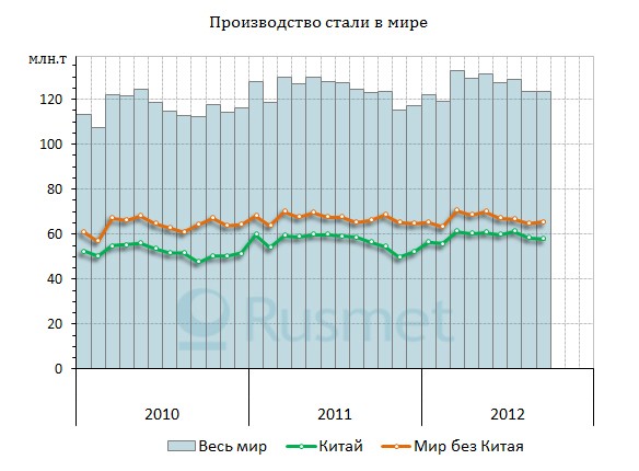 Всего за первые три квартала 2012 года мировое производство стали составило 1141,6 млн. т. Это на 0,5% отстает от показателя аналогичного периода годичной давности. Несмотря на экономический спад отрасль продолжает придерживаться прошлогоднего графика.