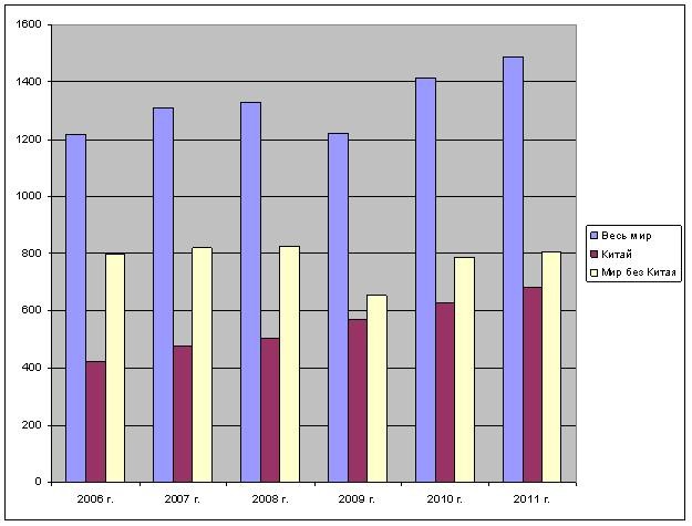 В Китае в 2011 году было произведено 683,3 млн. т стали. Прирост по отношению к 2010 году достиг 9,0%, а к докризисному 2007-му 39,7% или почти 200 млн. т! Причем, отрасль в последние месяцы функционирует со значительной недогрузкой. Если в июне в стране ежедневно выплавлялось более 2,0 млн. т стали, то в последнюю декаду декабря только 1,626 млн. т.