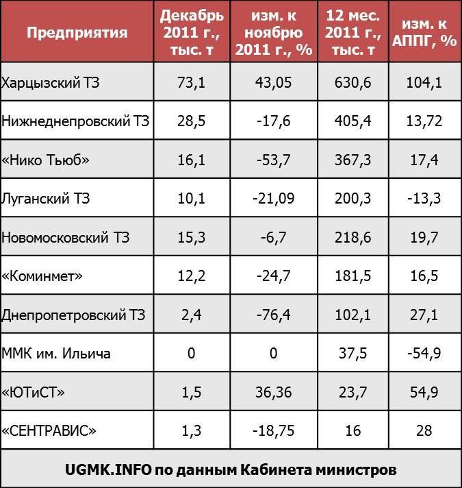 Наибольший рост производственных показателей по итогам 2011 г. продемонстрировали такие предприятия как Харцызский ТЗ (104,1% к 2010 г.), завод "ЮТиСТ" (54,9%), Днепропетровский ТЗ (27,1%) и Новомосковский ТЗ (19,7%). Спад был зафиксирован только на ММК им. Ильича (54,9%) и Луганском ТЗ (-13,3%).