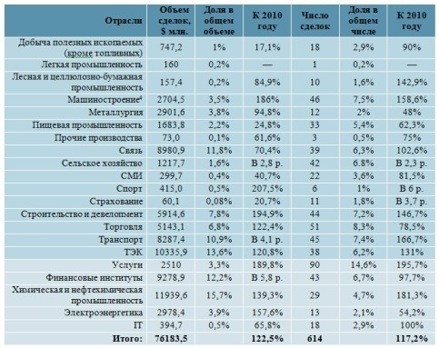 Отраслевая сегментация российского рынка слияний и поглощений в 2011 г.: