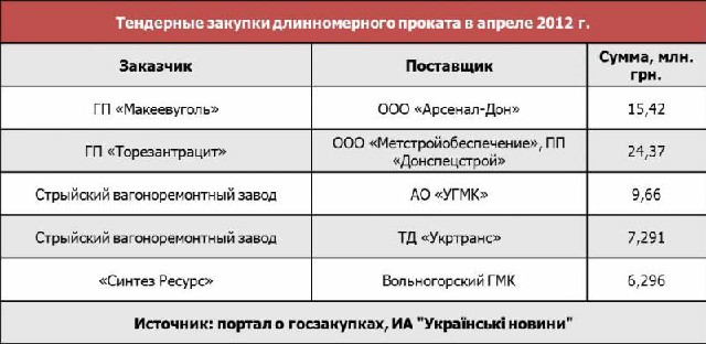 Согласно проведенному анализу тендерной активности государственных закупок длинномерного проката, в апреле наиболее крупные закупки совершали предприятия угледобывающей и вагоностроительной отраслей. Более подробная информация о тендерных закупках длинномеров в апреле предоставлена в таблице ниже.