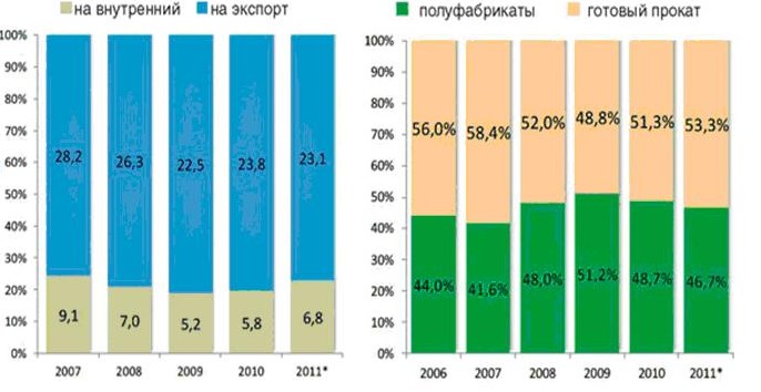 а – экспорт/внутренний рынок; б – полуфабрикаты/ готовый прокат -- UGMK.INFO (Украина)