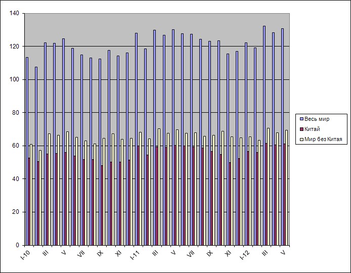 Всего за пять месяцев в мире (точнее, в 62 странах, подающих данные в WSA) было выплавлено 635,6 млн. т стали, на 0,8% больше, чем за тот же период годичной давности. Глобальная металлургическая отрасль продолжает идти фактически по прошлогоднему графику, хотя рыночная ситуация с тех пор изменилась не в лучшую сторону.