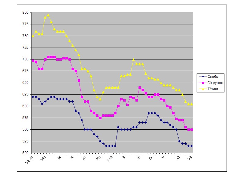 Что же касается плоских полуфабрикатов, то для них вполне вероятным выглядит даже не сохранение прежних цен, а понижение. Некоторые компании уже выставляют предложения на август примерно на тех же условиях, что и в предыдущем месяце, однако они не находят понимания у азиатских клиентов. В Восточной Азии прокатчики, указывая на продолжающееся понижение на региональном рынке плоского проката, требуют удешевления слябов на $15-20 за т, т.е. до около $500 за т FOB и даже менее для продукции российского и украинского производства.