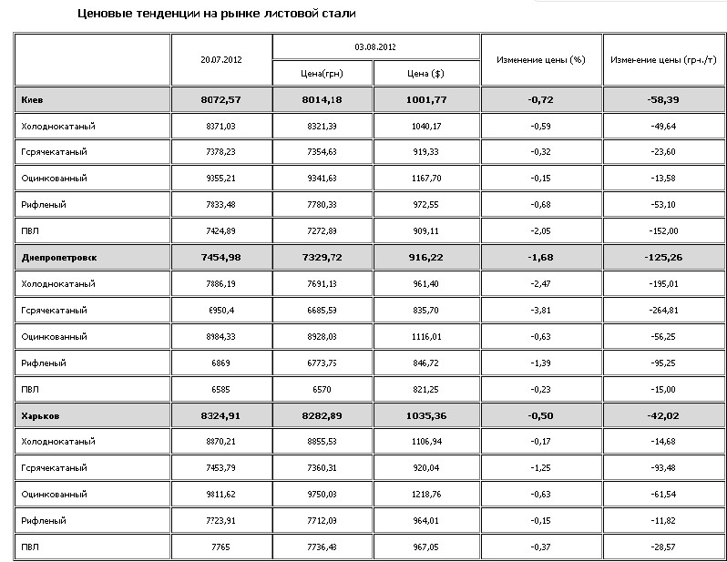 С 20 июля по 3 августа 2012 г. прайсовые цены на листовую сталь в Киеве, Днепропетровске и Харькове понизились. Об этом свидетельствуют данные index.ugmk.info.