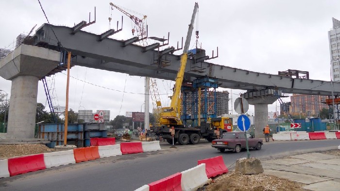 Идет монтаж мостовых металлоконструкций транспортной развязки МКАД - Ленинградское шоссе.