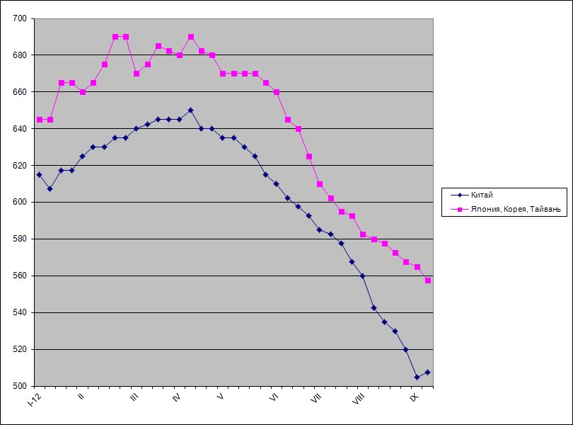 Основная проблема азиатских металлургов заключается в недостаточном спросе на стальную продукцию со стороны их экспортно ориентированных экономик. По оценкам британского банка HSBC, объем экспортных заказов во всех крупных странах Восточной Азии сокращался все лето. Осенью возможно некоторое увеличение спроса со стороны США, но в Европе в ближайшие месяцы не ожидается никаких изменений к лучшему.