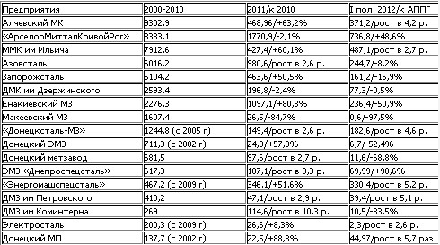 – В 2012 г «Донецкий МЗ», «Алчевский МК» и комбинат «Запорожсталь» расширили объемы использования ПУТ, что стало одним из факторов заметного снижения потребления отечественной металлургией природного газа.