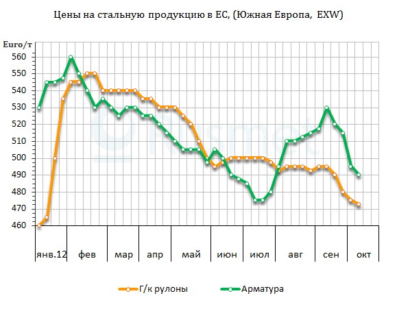 В начале октября стоимость китайского и российского горячего проката на юге Европы составляла около 440-450 евро за т CFR, вынудив итальянских металлургов сбросить цены до около 450-460 евро за т EXW. В целом импортные горячекатаные рулоны в Европе котируются в интервале 440-480 евро за т CFR/DAP. За пределами Италии европейские компании предлагают данную продукцию по 480-510 евро за т EXW, но, по словам трейдеров, при заключении реальных сделок производители готовы предоставлять скидки в размере до 40 евро за т.