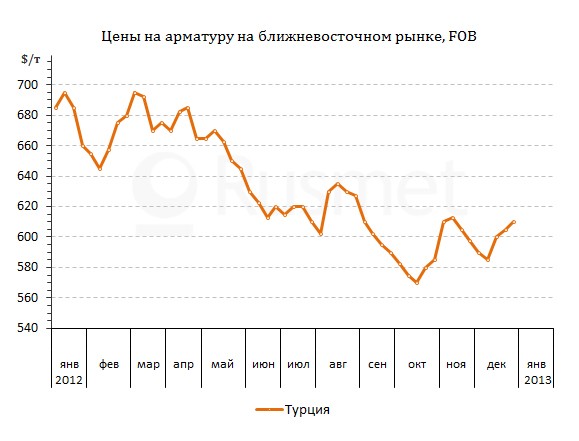 В первую неделю января турецкая арматура пользовалась спросом, в основном, в Ираке. Средний уровень цен составлял, при этом, около $610-615 за т EXW. Кроме того, иракские компании приобретали довольно значительные партии украинской арматуры непосредственно перед Новым годом примерно по $580 за т FOB. Компании из СНГ, вышедшие на рынок с новыми предложениями еще до Рождества, также котируют свою продукцию на уровне, близком к этой отметке.