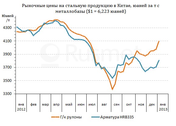 Китайский рынок стали переживает очередной подъем. Цены на горячекатаные рулоны в крупнейших городах страны и котировки на арматуру на Шанхайской фьючерсной бирже в начале января превысили отметку 4000 юаней ($643) за т – впервые с первой декады июля прошлого года.
