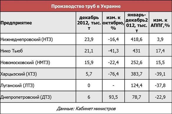 По данным Кабинета министров, в 2012 г. производство труб в Украине снизилось на 11,3% до 1,765 млн. т.