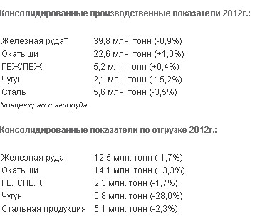 Производство железной руды по итогам 2012 г. составило 39,8 млн. тонн, что незначительно ниже уровня прошлого года (-0,9%) и связано проведением ремонтных работ в период ценового спада в 4К 2012.