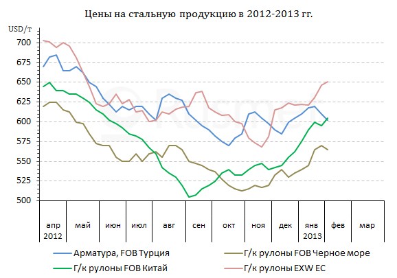 На мировом рынке стали идет давно ожидавшееся повышение цен. Котировки на плоский прокат прибавили за первый месяц 2013 года порядка $30-60 за т на большинстве региональных рынков, вернувшись примерно на уровень полугодовой давности. Длинномерный прокат в силу сезонных факторов проявил меньшую динамику, однако и этот сектор рынка завершил январь в плюсе. Но самое главное, что металлургические компании нацелены на дальнейший рост, рассчитывая на скорое наступление традиционного весеннего подъема деловой активности. Тем не менее, говорить о том, что на рынке произошел перелом, еще явно преждевременно.