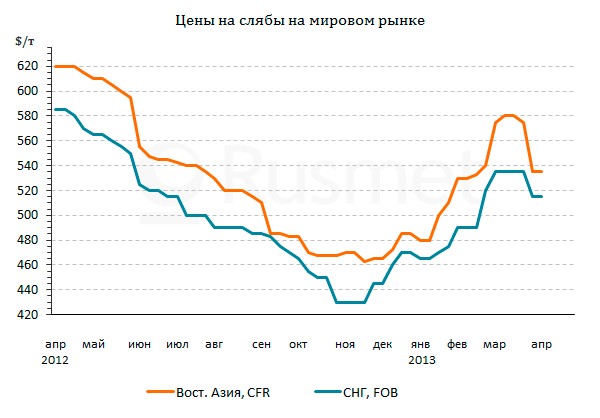 В феврале стоимость слябов из СНГ и Латинской Америки на азиатском рынке составляла $570-580 за т CFR. На этот же уровень цен ориентировались поставщики и в марте несмотря на падение региональных котировок на плоский прокат. Однако, когда российские и бразильские производители в конце марта пошли на уступки и согласились на удешевление слябов для Восточной Азии до $550-560 за т CFR, прокатчики посчитали эти котировки завышенными. Встречные предложения с их стороны поступали на уровне $530-540 за т CFR в середине марта и $510-520 за т CFR в начале апреля.
