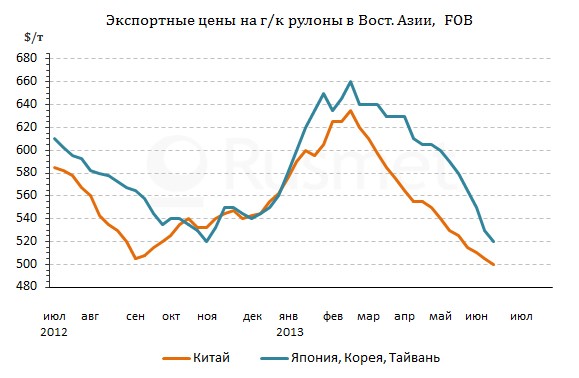 В начале июня китайские экспортеры горячекатаных рулонов под давлением потребителей были вынуждены сбросить цены до около $495-515 за т FOB. Предполагалось, что пауза во время Праздника драконьих лодок (фактически 8-12 июня) поможет стабилизировать котировки, но этого пока не случилось. Стоимость китайского горячего проката, наоборот, понизилась до $490-510 за т FOB, а новые встречные предложения со стороны покупателей в Корее, Индии и Вьетнаме поступают по $500 за т FOB и менее. Некоторые компании уже выставляют заказы на китайский толстый лист менее чем по $490 за т FOB, хотя в конце первой половины июня сделки, в основном, заключались из расчета $500-515 за т FOB.