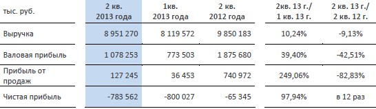 Снижение объемов реализации по сравнению с высокой базой 1 кв. 2013 г, в котором произошло признание продаж прошлых периодов, стало основной причиной снижения выручки. Снижение убытков от операционной деятельности было достигнуто благодаря сокращению производственных расходов в рамках проводимых мероприятий по оптимизации затрат. На уменьшение чистого убытка во 2 кв. 2013 г основное влияние оказало сокращение убытка от продаж, дополнительным фактором стало положительное влияние курса валют.