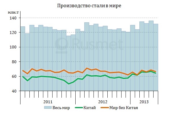 Всего за первое полугодие 2013 года объем мирового производства стали достиг 789,8 млн. т. Превышение показателя годичной давности составило 2,2%. Темпы роста лишь незначительно снизились по сравнению с 2,3% по итогам января-мая. В целом обстановка на мировом рынке выглядит весьма противоречивой. С одной стороны, в последние несколько недель спрос и цены пошли на повышение, а в начале осени ожидается окончательное восстановление. С другой, многие эксперты называют избыток предложения одной из основных проблем отрасли. По данным ОЭСР, излишек мощностей оценивается в настоящее время 334 млн. т в год, из которых около 200 млн. т приходится на Китай. Эти мощности находятся, если можно так выразиться, в ближнем резерве и могут быстро вернуться на рынок при улучшении ситуации. Поэтому, рост, прогнозируемый в августе-сентябре, может вскоре снова смениться спадом.