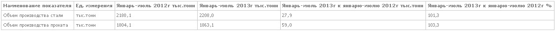 С января по июль 2013 года МК "Запорожсталь" увеличил производство стали — на 1,3% и проката — на 3,3%, по сравнению с аналогичным периодом 2012 г.