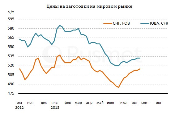 В Турции активность на рынке заготовок остается слабой. Многие местные компании предпочитают продавать не полуфабрикаты, а готовую продукцию, спрос на которую выше. Кроме того, из-за дороговизны металлолома стоимость турецких заготовок составляет не менее $540 за т EXW при внутренних поставках и $535-545 за т FOB при экспорте. Потребителей больше устраивает менее дорогостоящая продукция из СНГ.