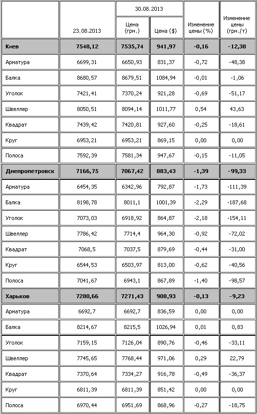 С 23 по 30 августа 2013 г. прайсовые цены на длинномерную продукцию в Украине снизились. Об этом свидетельствуют данные index.ugmk.info.
